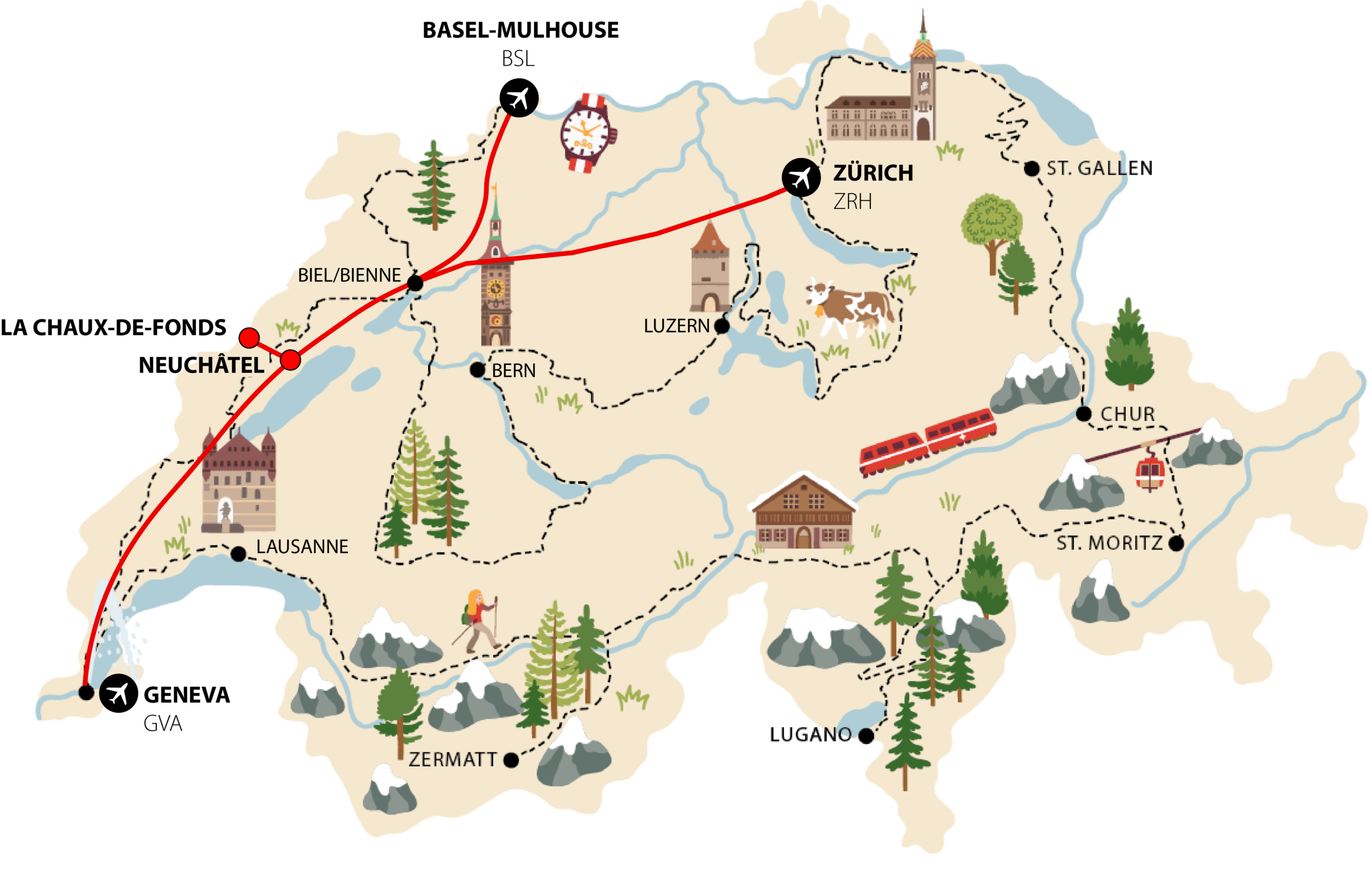 From any of the three airports (Geneva, Zurich, Basel-Mulhouse), the easiest and most economical option is to take the train, which will bring you to the city centre of Neuchâtel or La Chaux-de-Fonds in approximately two hours, depending on your accommodation location.